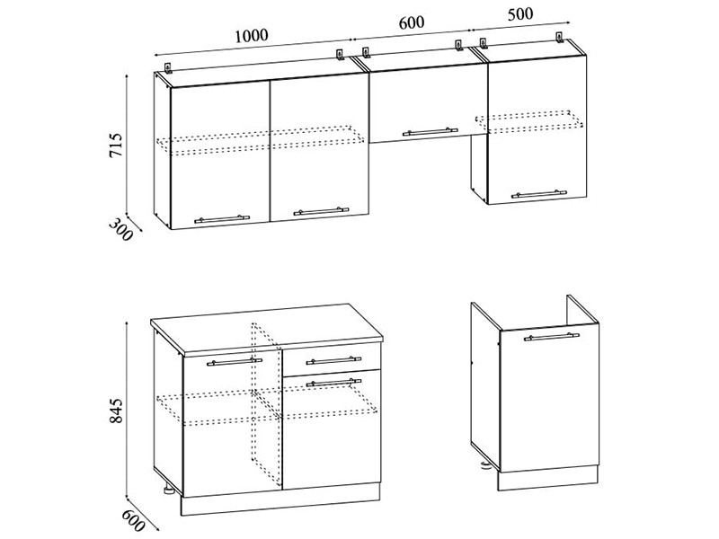- Глубина шкафов: Верхние 300 мм/Нижние 600 мм/Глубина столешницы 600 мм